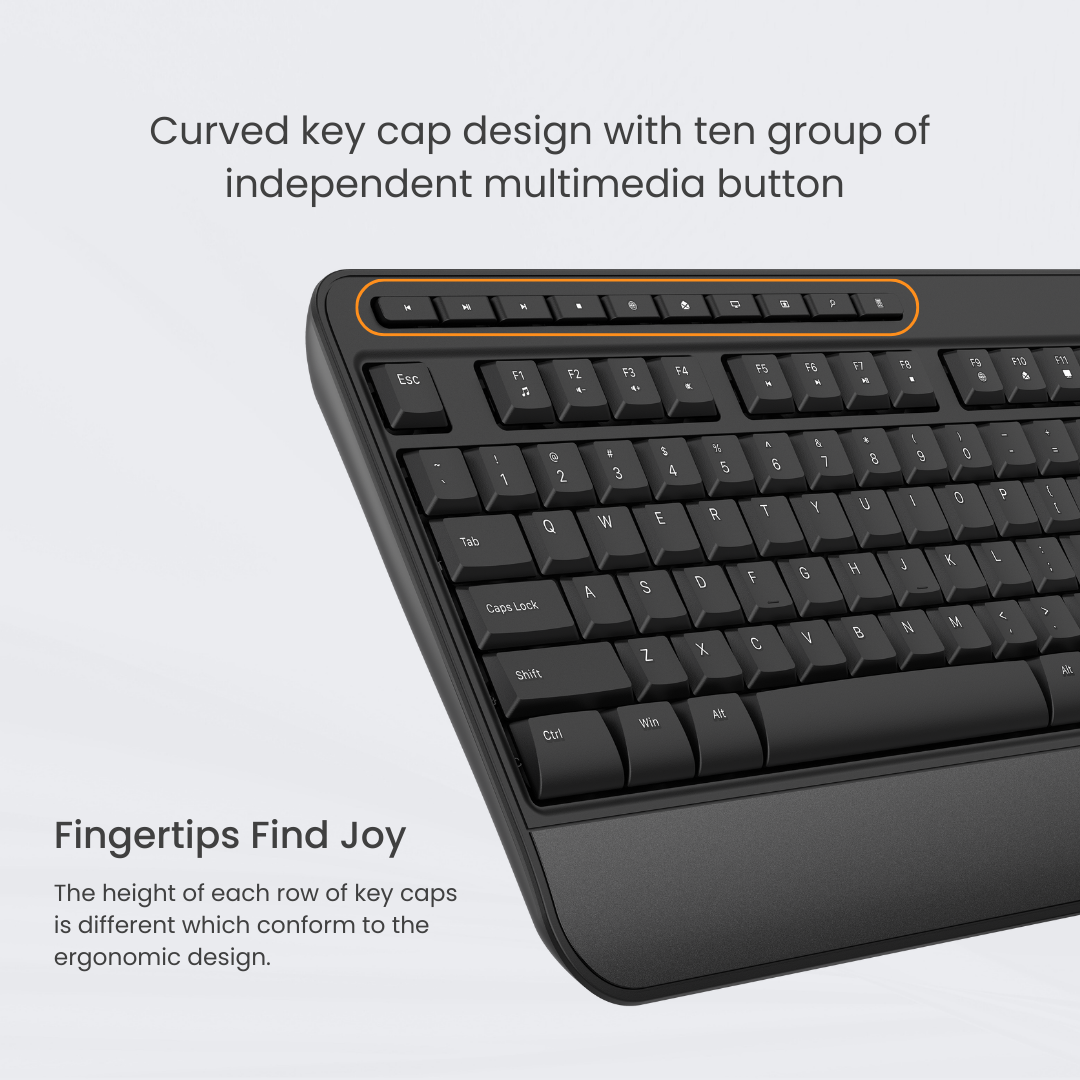 Discover our full-sized wireless ergonomic mouse and keyboard combo designed for all-day comfort and extended battery life. Featuring a contoured right-handed mouse and a full-size keyboard, this set lets you handle any task effortlessly.