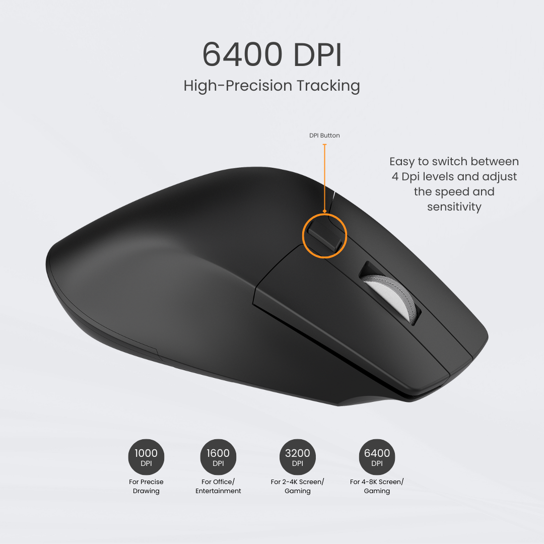 - Adjustable 4 DPI Settings: Allows users to customize cursor sensitivity for precise control and smooth navigation. CK-G1C combo mouse has 1000/1600/3200/6400 DPI settings, you’ll always find the most proper sensitivity intuitively through blinking DPI indicator to fulfil your job efficiently with precise tracking and fluent movement.