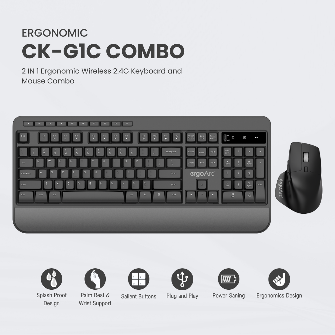 ErgoArc CK-G1C Wireless Full-Sized Ergonomic Mouse and Keyboard Combo: 6400 DPI, Optical Ergonomic, Splash-Proof, Quiet, and Long-Lasting