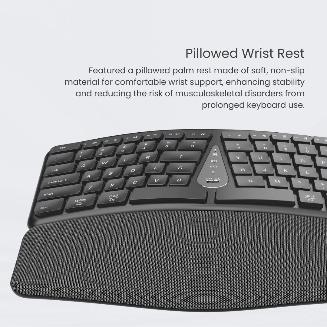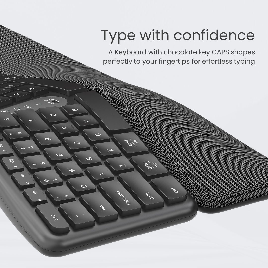 ergoArc® Ergonomic Keyboard with Palm Rest – Bluetooth & USB, Split Layout, Natural Typing, Stain-Resistant Fabric – For iPad, iPhone, Android, Laptop, PC, Mac, Windows, Chromebook, Linux – Rechargeable and Quiet buttons, – Black.